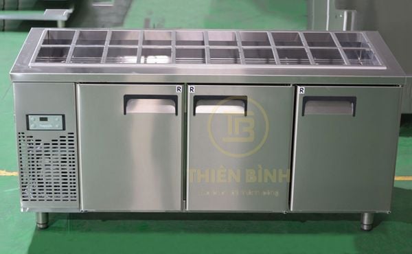 - Mặt bàn thiết kế các hộc chứa khay topping với thanh gờ đỡ khay linh hoạt, thuận tiện điều chỉnh theo kích thước khay sử dụng.