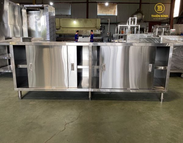 Bàn tủ inox 3 tầng 4 cánh lùa có mặt bàn rộng, cánh cửa lùa tiện dụng, khung vững chắc chịu lực tốt, giúp lưu trữ gọn gàng và thao tác nhanh chóng.
