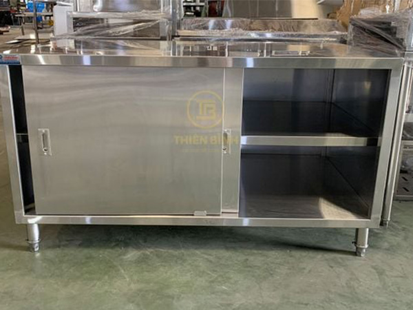 Bếp Thiên Bình cung cấp bàn tủ sơ chế cửa lùa chất lượng với giá cả cạnh tranh, được làm từ inox loại 1 bền bỉ, chịu lực tốt và chống hoen gỉ hiệu quả. Sản phẩm có thiết kế công nghiệp thông minh, mặt bàn rộng rãi dùng để sơ chế, băm, chặt hay bày biện nguyên liệu và thực phẩm thành phẩm, kết hợp hai ngăn đựng đồ phía dưới giúp tối ưu không gian bếp, giữ gọn gàng, sạch sẽ. Cửa lùa tiện dụng tiết kiệm diện tích, chân bàn tăng chỉnh linh hoạt, dễ điều chỉnh phù hợp với địa hình. Bàn tủ sơ chế được gia công tỉ mỉ, các góc cạnh bo tròn, mài nhẵn, hàn bằng khí Argon chống oxy hóa, đảm bảo an toàn và tính thẩm mỹ cao, phục vụ tốt cho nhà bếp, quán ăn, khách sạn hay bếp công nghiệp.