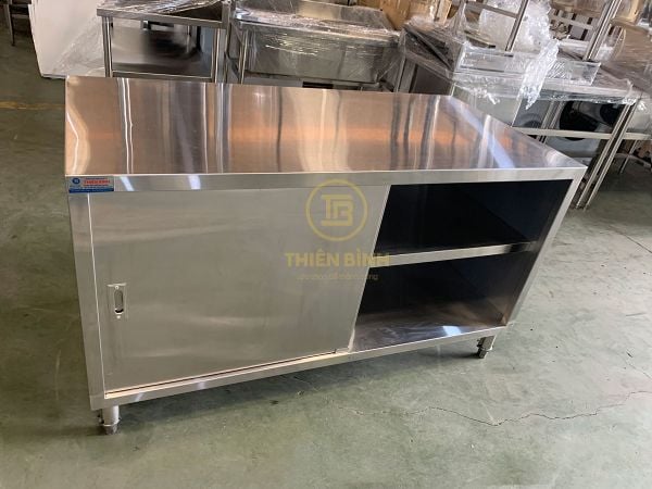 Bàn tủ sơ chế cửa lùa thiết kế mặt bàn rộng, 2 ngăn dưới tiện dụng, cửa lùa tiết kiệm diện tích, inox bền bỉ chống gỉ, dễ vệ sinh, phù hợp bếp công nghiệp.