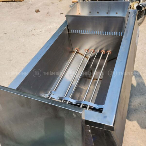 - Sử dụng nguồn điện 380V làm nóng thanh nhiệt đặt trong lớp dầu, giúp thực phẩm chín đều và vàng đẹp.
