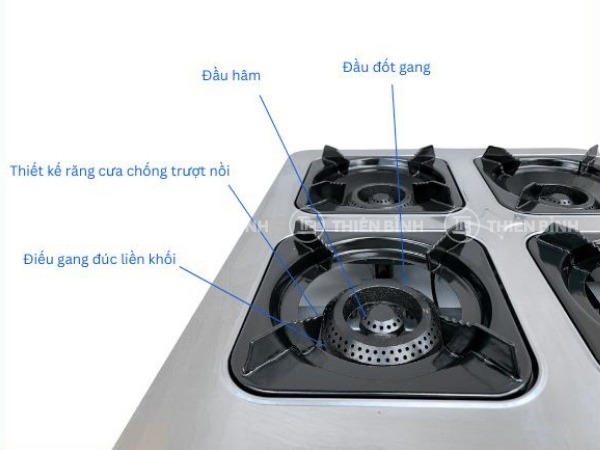 - Thiết kế 4 họng bếp bằng gang đúc liền khối với độ dày cao giúp bếp chịu nhiệt tốt và duy trì ngọn lửa đều khi hoạt động trong thời gian dài.