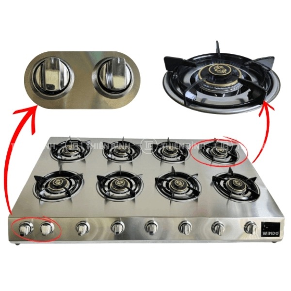 Bếp gas công nghiệp 8 họng Windo sử dụng van gas thấp áp an toàn, dễ dàng sử dụng, kiềng bếp 5 chân chắc chắn, đầu đốt bằng đồng có độ bền cao