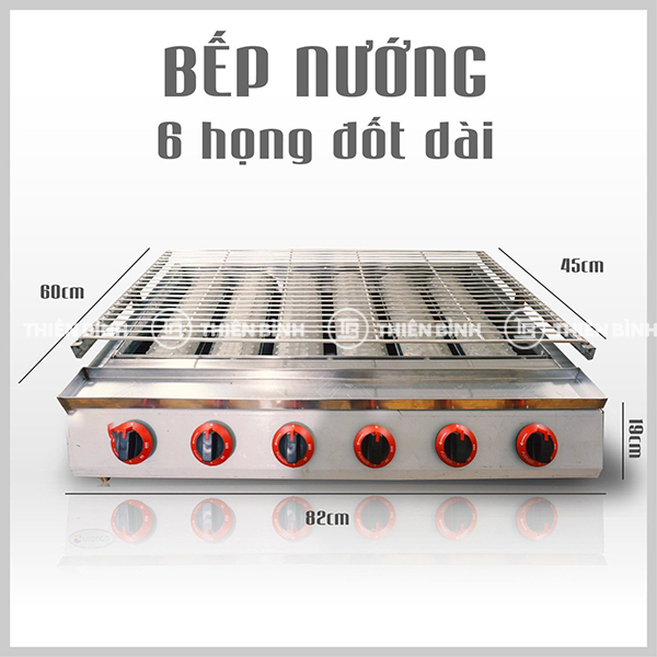 - Bếp nướng hồng ngoại 6 họng đốt dài BN-F2.6GD sở hữu kiểu dáng hiện đại, đường nét đơn giản, kích thước 820x600x190mm phù hợp nhiều không gian bếp từ quán ăn đến nhà hàng.