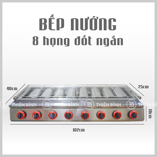 Bếp nướng hồng ngoại 8 họng đốt ngắn BN-F2.8GN dùng để chế biến nhanh các món nướng như thịt, cá, hải sản, rau củ với nhiệt tỏa đều, chín đồng đều, hạn chế khói và mùi. Thiết bị phù hợp cho quán ăn, nhà hàng, bếp phục vụ số lượng lớn nhờ khả năng nướng nhiều thực phẩm cùng lúc và kiểm soát nhiệt linh hoạt.