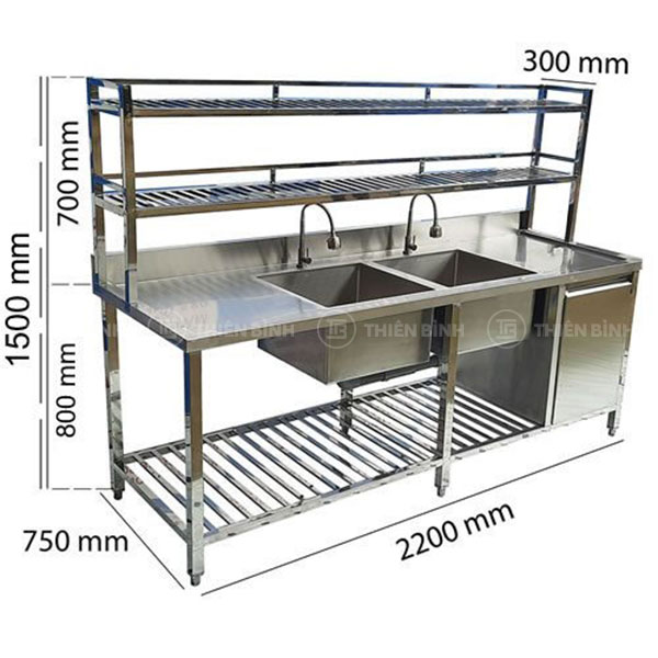 | Cấu trúc sản phẩm | 2 hố chậu, 2 vòi rửa, 1 giá nan dưới, kệ inox 2 tầng giá nan có lan can, 1 hộc tủ |