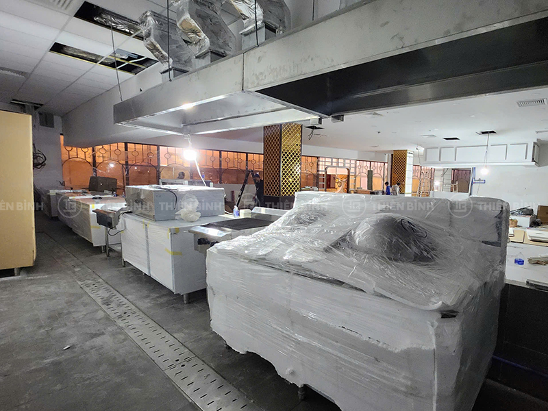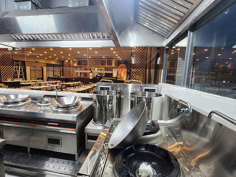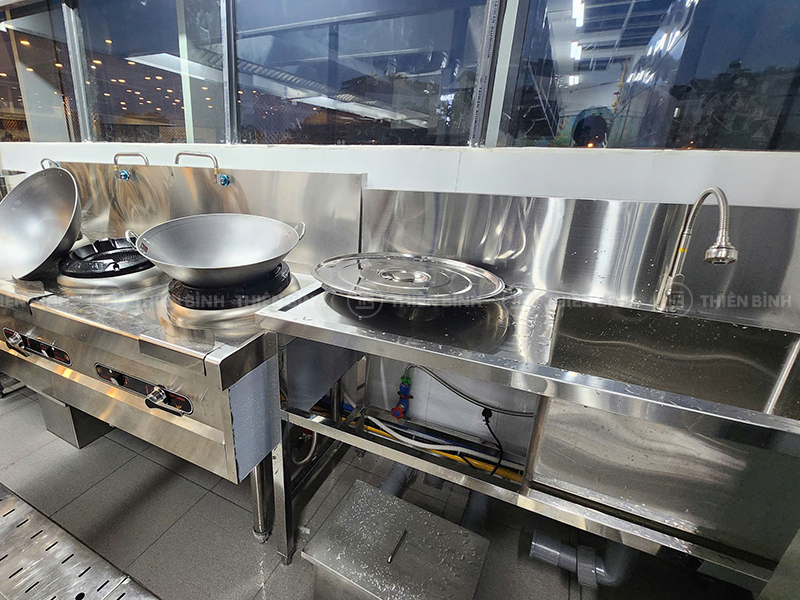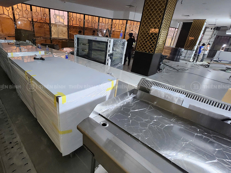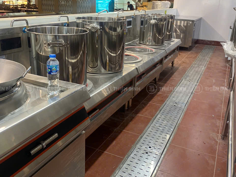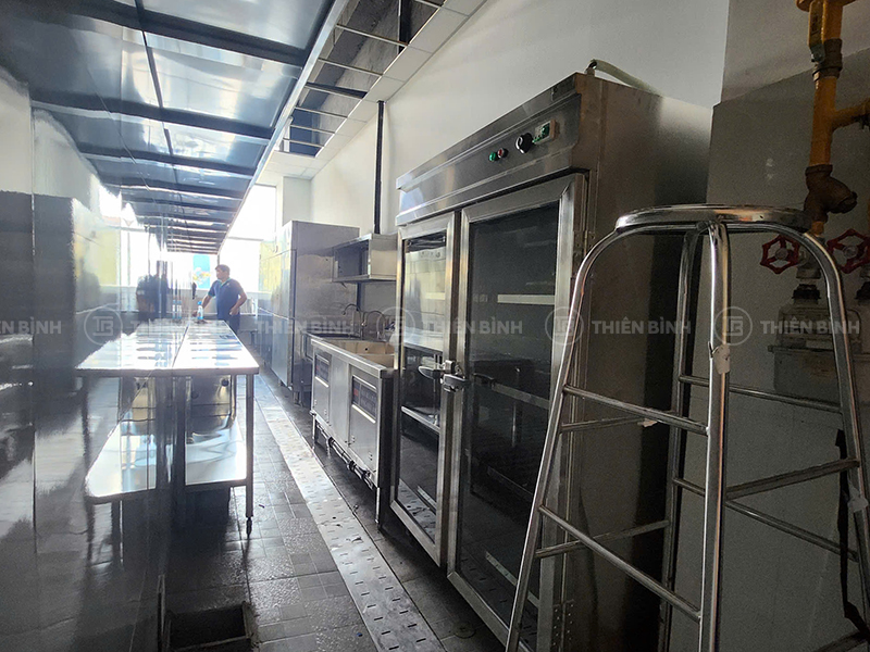 Để phục vụ được lượng lớn các món ăn, nhà hàng đã được trang bị đa dạng các thiết bị bếp công suất lớn từ bếp ábếp âubếp chiên phẳngbếp nướng than đá… Đồng thời, để tối ưu không gian khu bếp, bên cạnh các tủ bảo quản đứng, hệ thống bàn đông, bàn mát đã được ưu tiên sử dụng để tận dụng được mặt bàn làm bàn thao tác.
