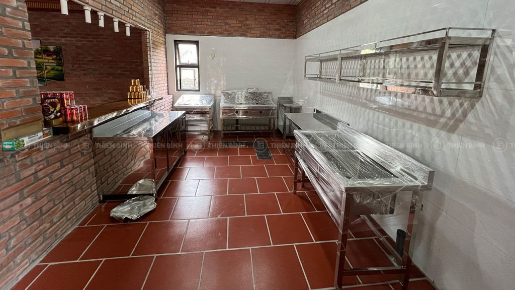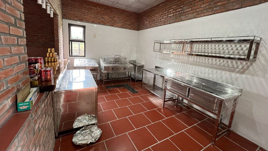 Bên cạnh đó, nhằm tối ưu hóa khu bếp, hệ thống các thiết bị inox như giá kệ inox, chậu rửa công nghiệp, bàn bếp inox…cũng đã được thiết kế và cung cấp. Chất liệu inox được chọn là inox 304 dày dặn, chống han gỉ trong quá trình sử dụng. Nhờ đó, không chỉ đảm bảo được an toàn vệ sinh mà còn làm đẹp cho không gian khu bếp.