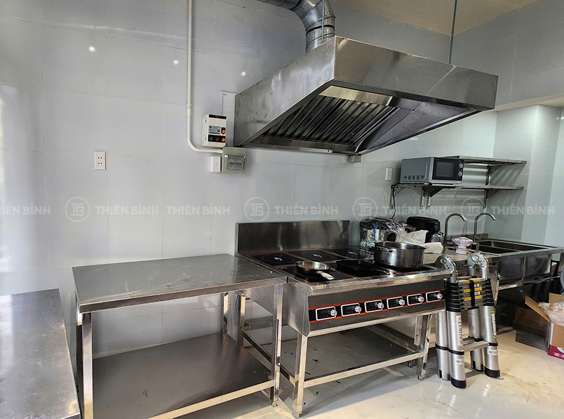 Sau khi lựa chọn và chốt được danh sách các thiết bị, Thiên Bình nhanh chóng chuẩn bị để có thể thi công, lắp đặt đúng tiến độ. Đối với các thiết bị inox như chậu rửa, bàn sơ chế, tủ inox và hệ thống thông gió hút mùi, xưởng sản xuất của Thiên Bình tiến hành sản xuất theo kích thước phù hợp với không gian bếp nhà hàng.