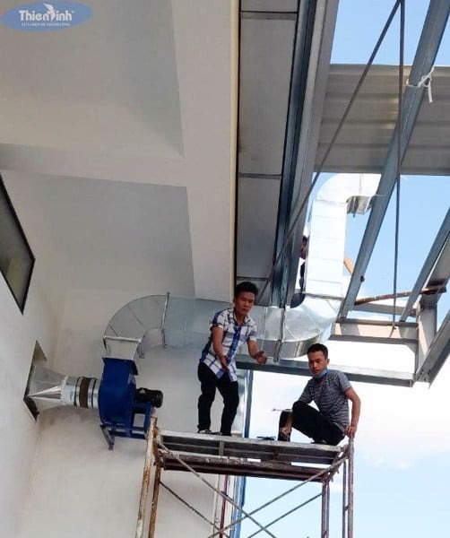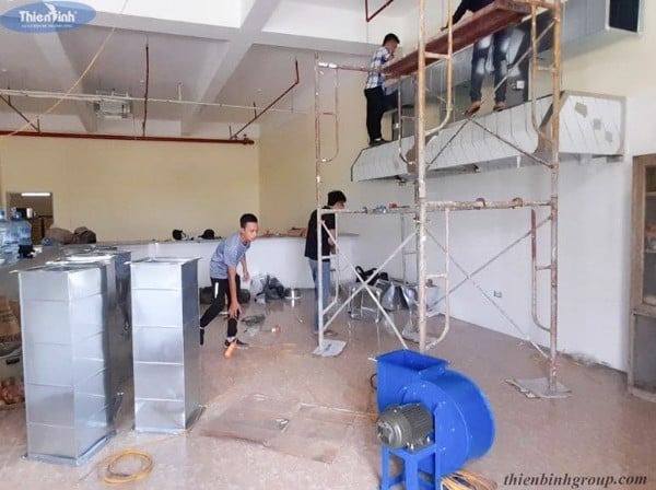 Đội kỹ thuật của Thiên Bình lắp đặt đường ống của hệ thống hút mùi