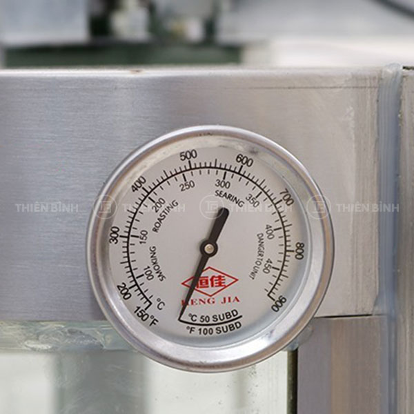 - Đồng hồ đo nhiệt độ đặt trên thân giúp theo dõi mức nhiệt trực quan để người dùng đưa ra thời gian quay phù hợp cho từng loại thực phẩm.