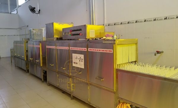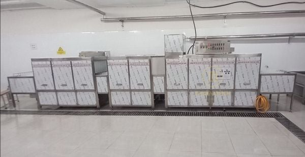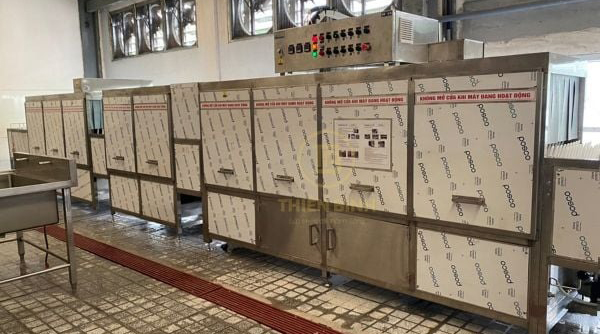 - Máy sử dụng hệ thống điều khiển PLC vận hành ổn định, không bị ảnh hưởng bởi hơi nước trong môi trường bếp. Cấu tạo gồm khoang rửa và khoang sấy liên hoàn, giúp xử lý bát đĩa nhanh chóng, giảm tối đa nhân công và thời gian so với rửa thủ công.