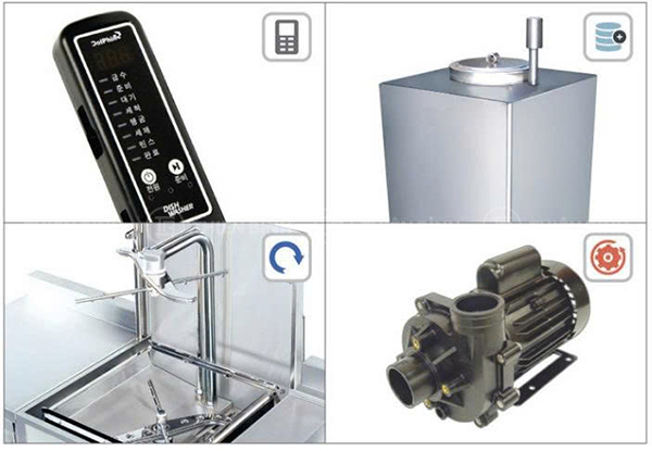 - Hệ thống PCB điều khiển thông minh thiết lập trình tự rửa tối ưu và giám sát toàn bộ hoạt động của máy. Máy cũng được trang bị khóa an toàn nhằm hạn chế rủi ro trong quá trình vận hành.