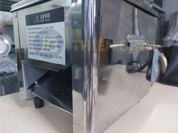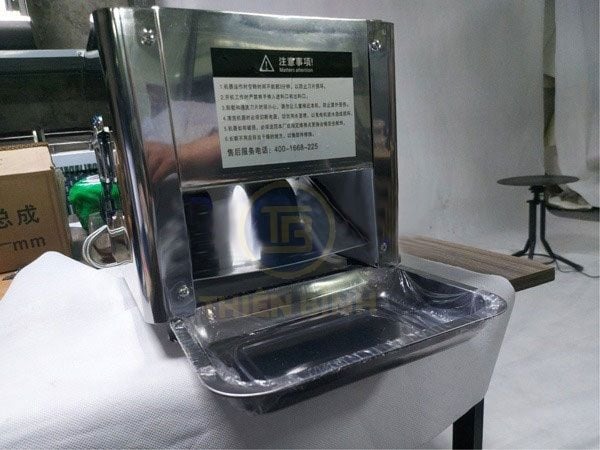 - Thịt sau khi thái sẽ rơi xuống qua máng dốc phía trước vào khay đựng đặt bên dưới, chiều cao khay hợp lý giúp hứng thịt gọn gàng, không rơi vãi.