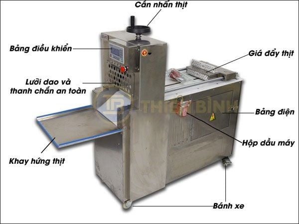 - Giá đẩy thịt có đinh ghim cố định miếng thịt và tự động đưa thịt vào bộ dao theo chương trình đã thiết lập. Bảng điều khiển đơn giản, dễ thao tác với các chức năng như hẹn giờ, chọn chế độ cắt, thiết lập số nhát dao và điều chỉnh độ dày lát thịt từ 0.1 mm.