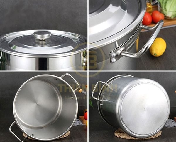 - Nồi inox công nghiệp có thiết kế đơn giản, tinh tế, chuyên dụng cho nhiều loại bếp như bếp từ mặt phẳng, bếp gas, bếp hồng ngoại,…