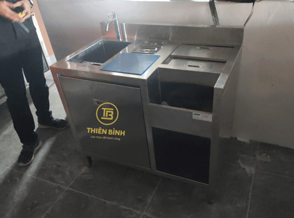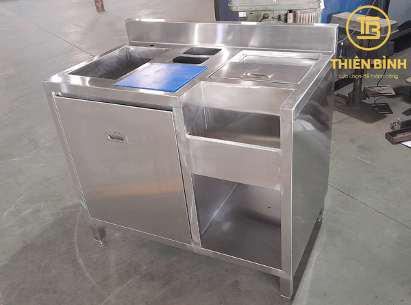 Quầy pha chế mini TB-QBMN kiểu dáng hiện đại, bề mặt inox nhẵn bóng, tích hợp khu vực rửa, lưu trữ nguyên liệu và thùng đá âm quầy, dễ dàng vệ sinh.