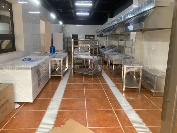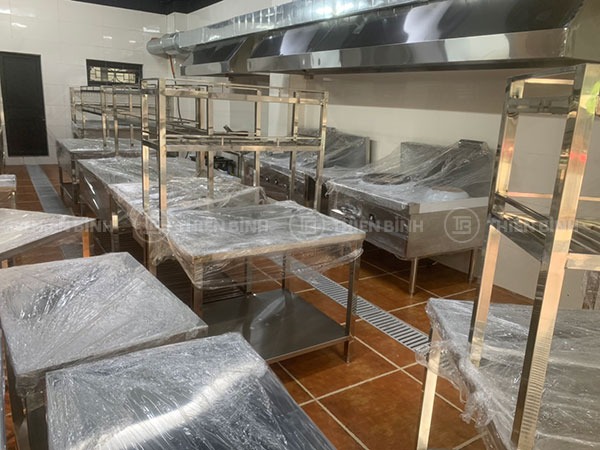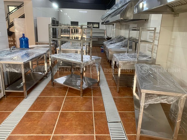 Bên cạnh đó, để phục vụ tốt cho quá trình chế biến, phục vụ các món ăn, Thiên Bình Group đã thiết kế một hệ thống các thiết bị inox như bàn bếp inox, các giá nan inox, chậu rửa inox công nghiệp theo đúng kích thước và thiết kế yêu cầu của chủ nhà hàng. Tất cả các thiết bị đều được làm từ chất liệu inox Posco Hàn Quốc dày dặn, bền đẹp dài lâu.