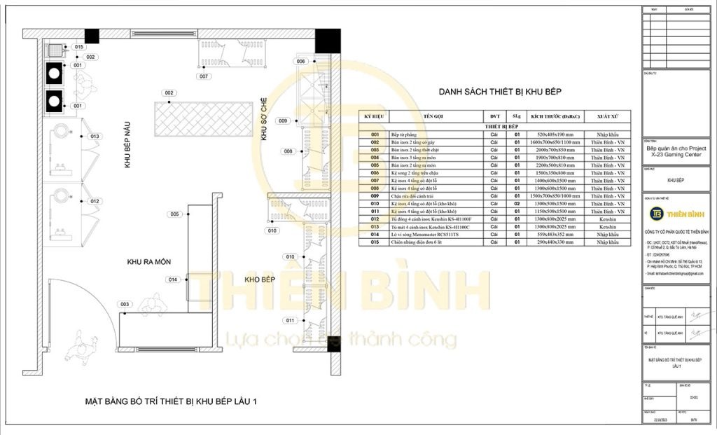 Sau khi hợp đồng được ký kết, đội ngũ nhân viên của Thiên Bình đã nhanh chóng có mặt tại cơ sở Project X-23 để tiến hành khảo sát mặc bằng, đo đạc và thiết kế bản vẽ. Sự tinh tế, tỉ mỉ trong bản vẽ được thể hiện rõ qua từng không gian bếp, từ khu vực sơ chế, nấu ăn cho đến khu ra món, kho để đồ.