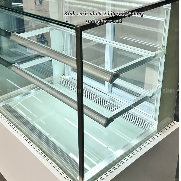 - Kính trưng bày 2 lớp tích hợp sưởi chống đọng sương, giữ mặt kính luôn trong suốt ngay cả khi môi trường trên 30°C, đảm bảo bánh luôn rõ nét và thu hút ánh nhìn.