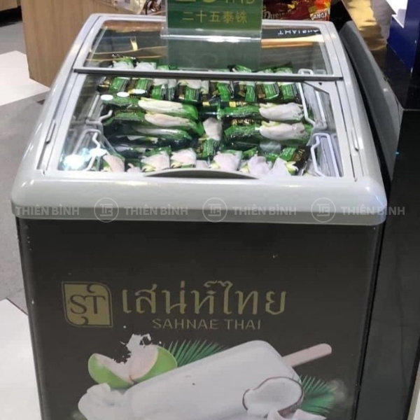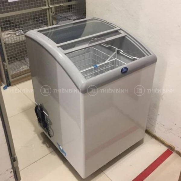 Tủ đông nằm cửa kính cong Sanden SNC-0155 nổi bật với kiểu dáng nằm ngang, cửa kính cong mở trượt, dung tích 152L, hiệu quả cao trong trưng bày và bảo quản.