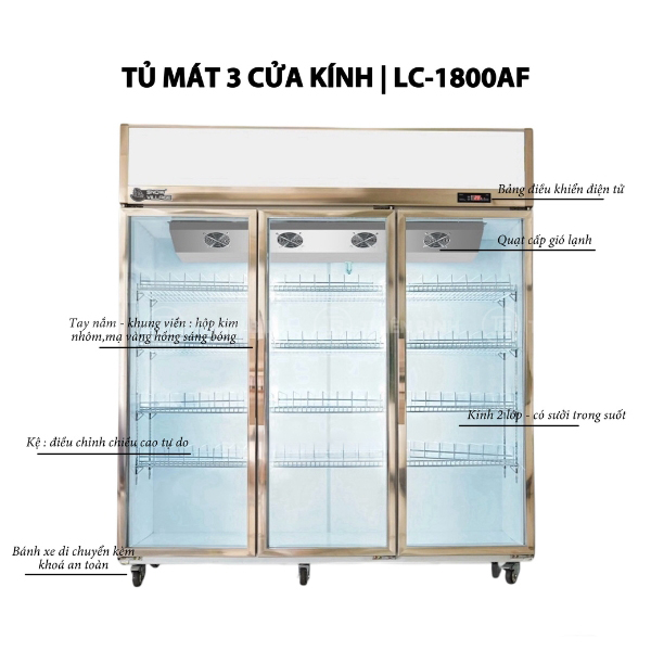 Tủ mát 3 cánh kính Snow Village LC-1800AF sở hữu hệ thống quạt gió làm lạnh sâu, dung tích lớn, giúp bảo quản thực phẩm tươi lâu và trưng bày hiệu quả.