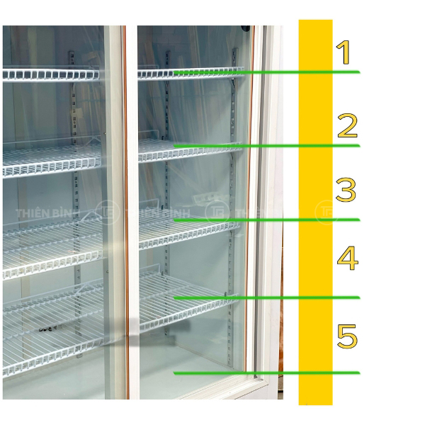- Tủ có dung tích lớn 1420 lít, được phân chia thành 4 tầng giá nan dài 1.8m và một tầng trệt rộng rãi, tạo không gian lưu trữ rộng để phân loại và trưng bày đa dạng các loại thực phẩm, rau củ, đồ uống với số lượng lớn. Thiết kế này giúp tối ưu hóa việc sắp xếp, đồng thời hạn chế tối đa khả năng lây nhiễm chéo giữa các loại hàng hóa.