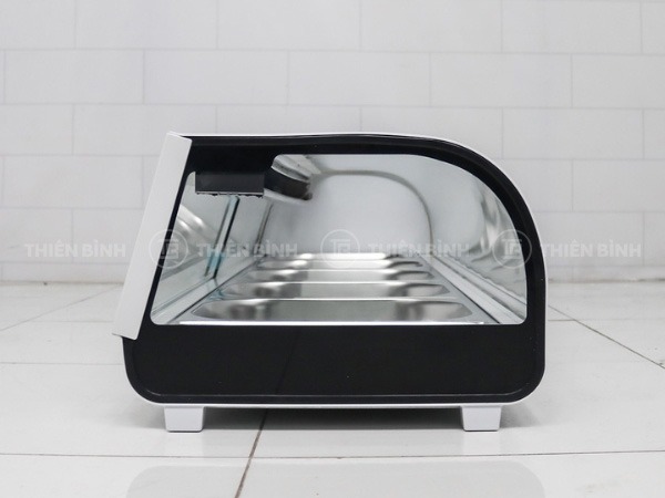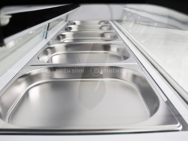 Thiết bị còn đóng vai trò là tủ trưng bày hiệu quả nhờ hệ thống khay chuẩn 1/2 GN kết hợp mặt kính cường lực trong suốt, cho phép sắp xếp thực phẩm gọn gàng, trực quan, tạo sự thuận tiện cho khách hàng khi quan sát và lựa chọn.