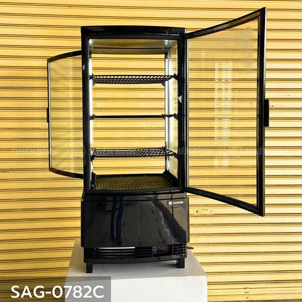 Tủ trưng bày bánh 4 tầng để bàn Sanden SAG-0782C thiết kế nhỏ gọn với 2 cửa mở trước – sau, dải nhiệt bảo quản 2 – 12ºC, cửa kính trong suốt được hút chân không, có đèn LED chiếu sáng