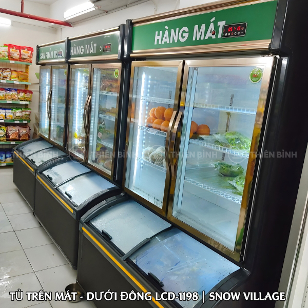 Tủ trưng bày thực phẩm trên mát dưới đông Snow Village LCD-1198 làm lạnh hiệu quả, kết hợp cánh kính có sấy chống mờ và đèn LED chiếu sáng làm nổi bật sản phẩm.