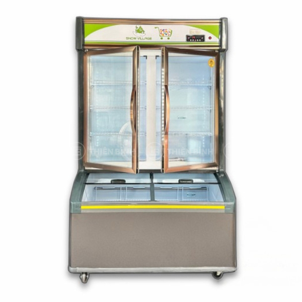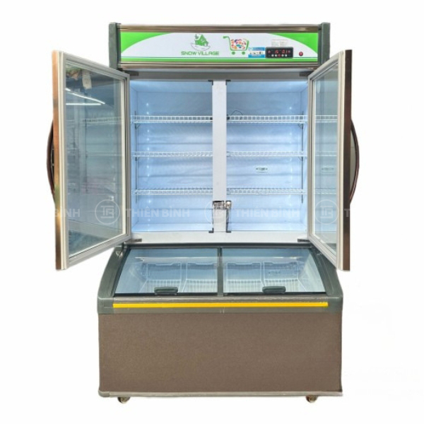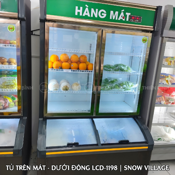 Tủ trưng bày thực phẩm trên mát dưới đông Snow Village LCD-1198 đáp ứng tốt nhu cầu bảo quản và bày bán đa dạng mặt hàng thực phẩm trong một thiết bị duy nhất, với ngăn mát phía trên dùng để trưng bày các sản phẩm bán nhanh trong ngày như rau củ, trái cây, đồ uống và ngăn đông bên dưới giúp lưu trữ dài ngày các loại thực phẩm đông lạnh, thịt cá, hải sản, đảm bảo sự tiện lợi, tiết kiệm diện tích.